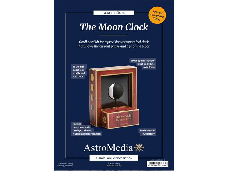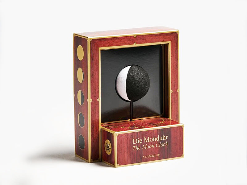 Inside the Moon Clock, a half-white, half-black sphere turns very slowly, driven by a special battery powered mechanism so that it continuously displays the current phase of the Moon. It does this minute to minute, from the first delicate Crescent Moon, to the waxing Half Moon, to the Full Moon, and then back to the New Moon. The representation of the phases is as accurate as the Moon itself, because the always half illuminated Moon behaves the same way in its interaction with the Sun.